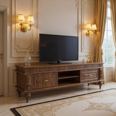میز تلویزیون کلاسیک مدل دنیز، با پایههای تراشخورده و جزئیات طلایی، انتخابی لوکس برای سالن پذیرایی.