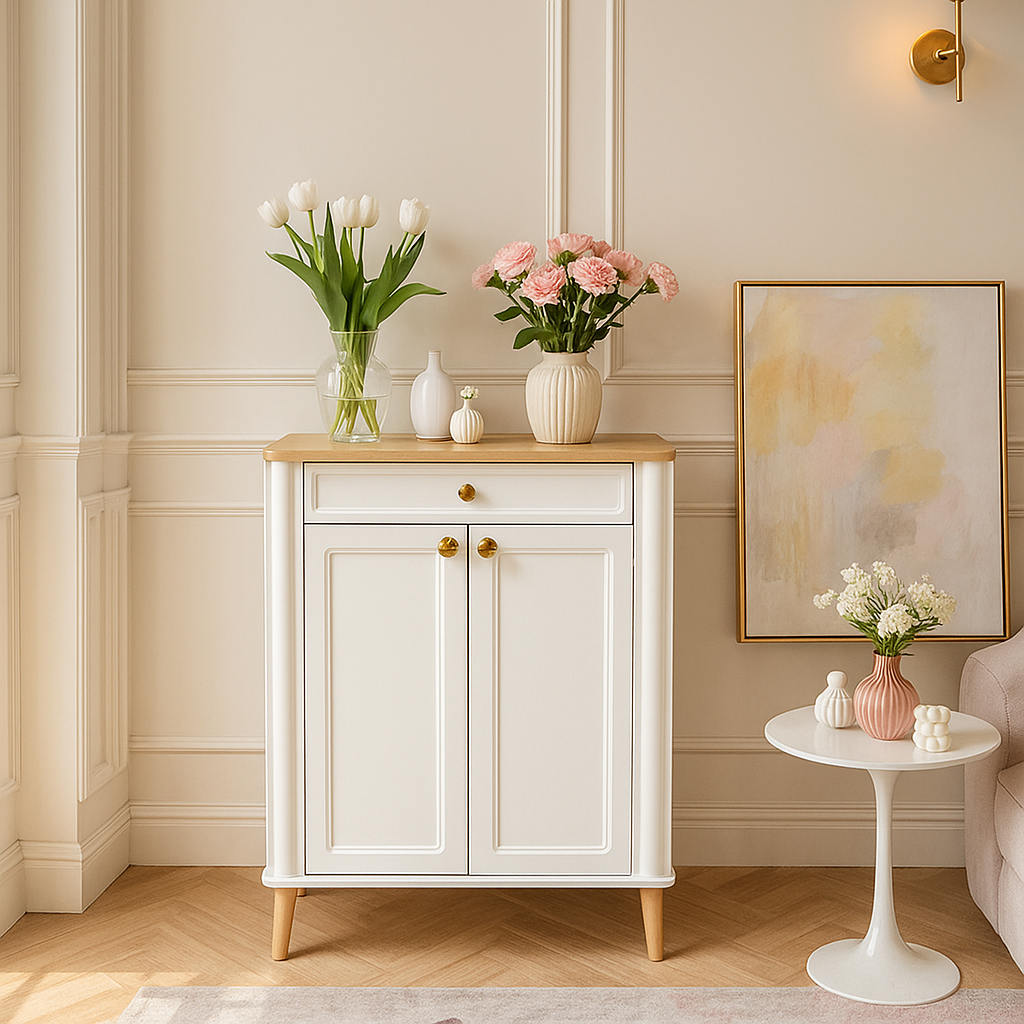 جاکفشی ائلآی با بدنه ملامینه و درب MDF وکیوم، دارای کشو و پایههای چوبی؛ مناسب دکوراسیونهای نئوکلاسیک و مدرن.