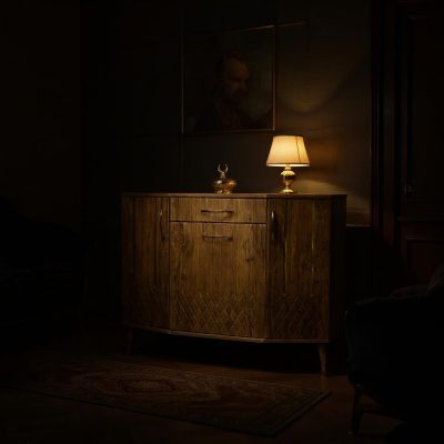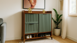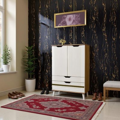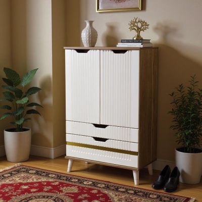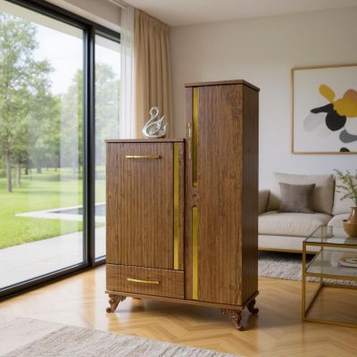طراحی این مدل شامل بخش دربدار برای نگهداری کفشها، یک قسمت کشویی با دسترسی سریع و فضای باز در پایین کابینت برای کفشهای دمدستی است. پایهها و جزئیات پایینی با قطعات طلایی ظریف تزئین شدهاند که حس لوکس و متفاوتی به محصول میبخشند.